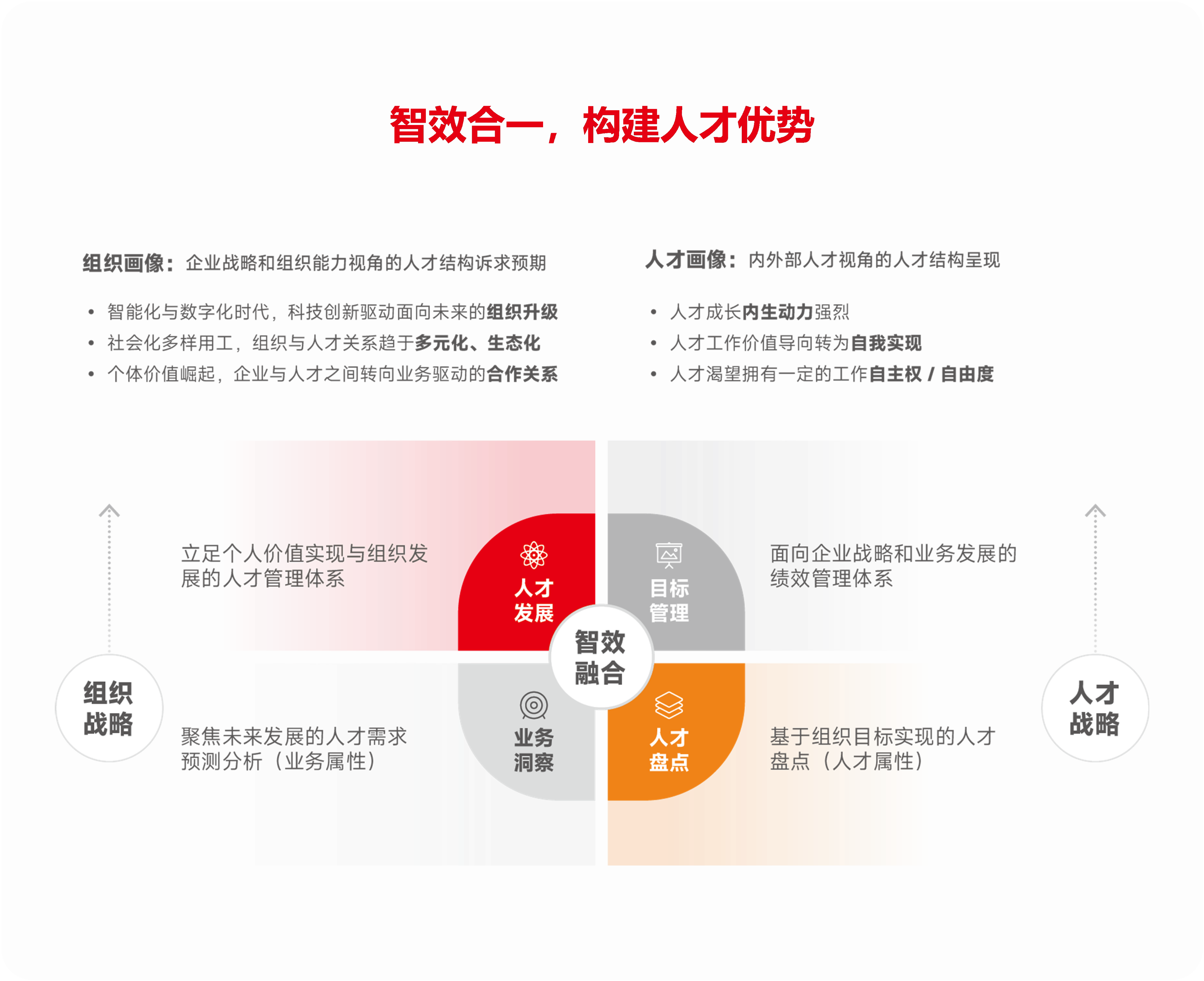 组织能力是企业高质量发展的基石。数智经济赋能人力资源服务业务并加速回归组织能力的价值定位,帮助企业建立更加智能化、高效化、个性化的员工服务能力,实现业人证合一、业人财合一,构建”智效合一”的人才优势,满足建筑地产企业在转型过程中的人才供应、人才发展和组织能力跃迁的需要。