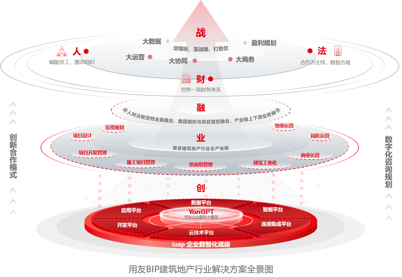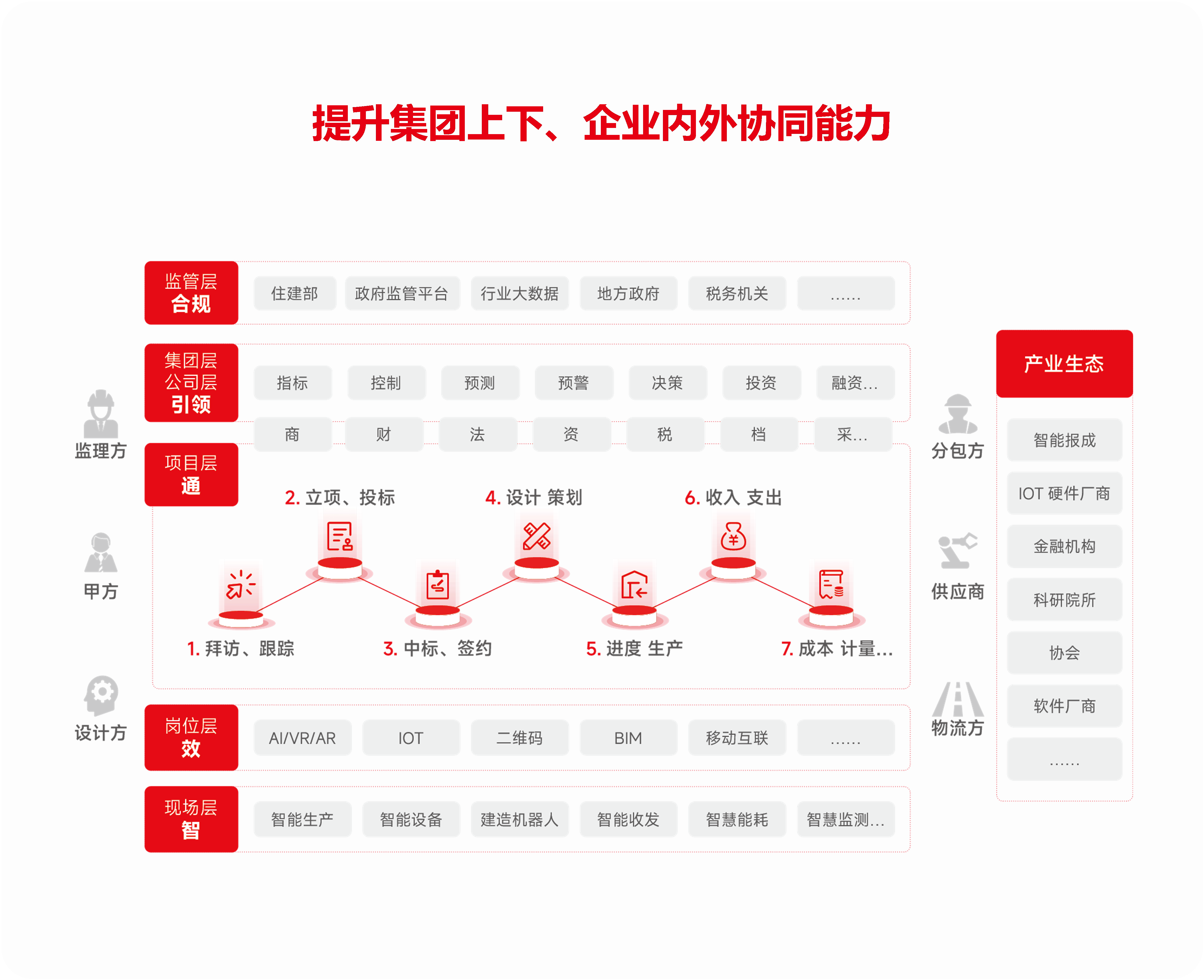 建筑地产行业具有高度专业、高度协同、高难度统筹、上下内外全面连接的特性,数字化和智能化为企业的内外部协同良性共赢带来革命性的变化。数智化促进企业内部无缝协作、企业战略上下贯彻融通,实现产业链内外协同,并对接监管层,实现资源共享和价值共创的同时也充分规避风险,从而推动整个行业的可持续发展。
