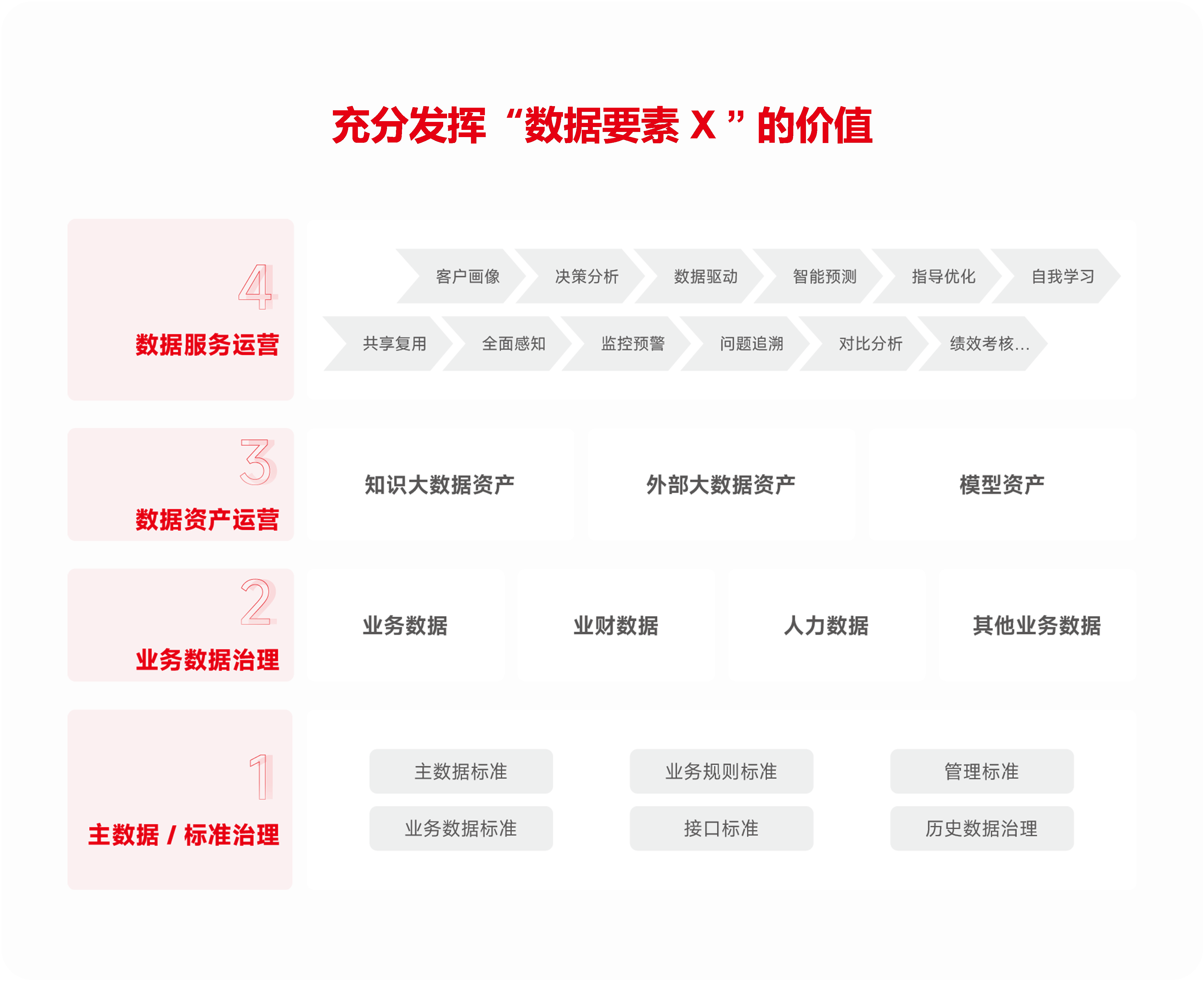 围绕业务价值、业务场景构建敏捷的数据治理体系,通过业务模型从专项视角、领域视角、组织视角发掘数据价值,将数据服务运营场景化、模型化、闭环化。通过充分释放“数据要素X”的价值,赋能建筑地产企业日常业务开展和战略落地,也为进入数据要素市场奠定能力基础。