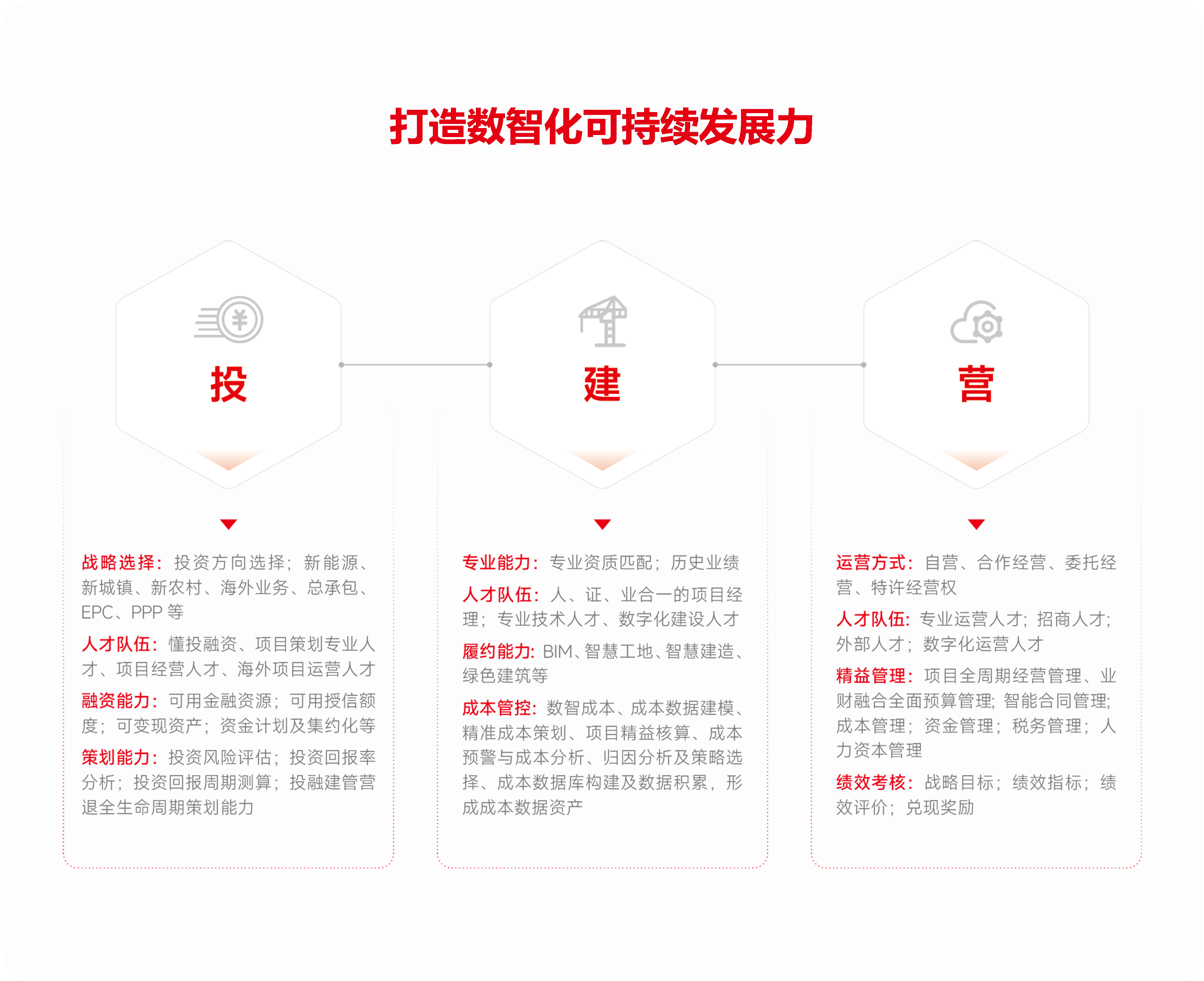 数智化推动建筑地产企业构建投建营一体化能力,整合投资、建设、运营全链条,促进企业向新业态、新领域、投资驱动和国际化发展,实现快速、高效、可持续增长,拓宽未来发展机遇,持续创新,行稳致远。