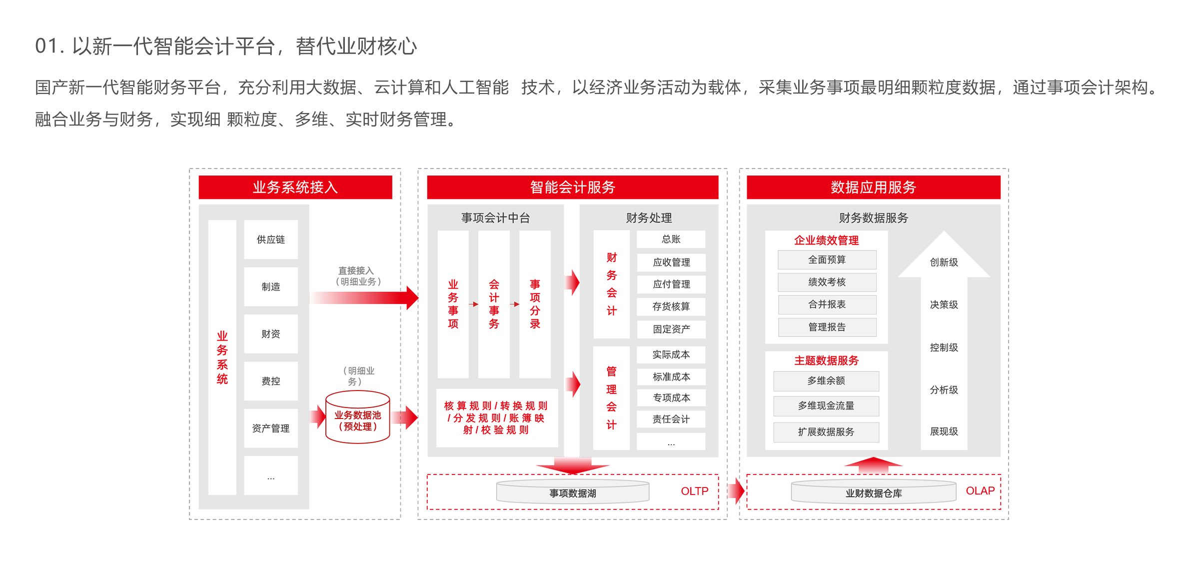 万达商管为大财务领域替代,从企业价值出发,整合了Oracle核算 系统及其他异构的报账、合并、税务、电子档案系统。在用友BIP 平台上实现了企业支出段的业财闭环管理。在收入段实现业财连接, 并具备了进一步深度融合的基础。