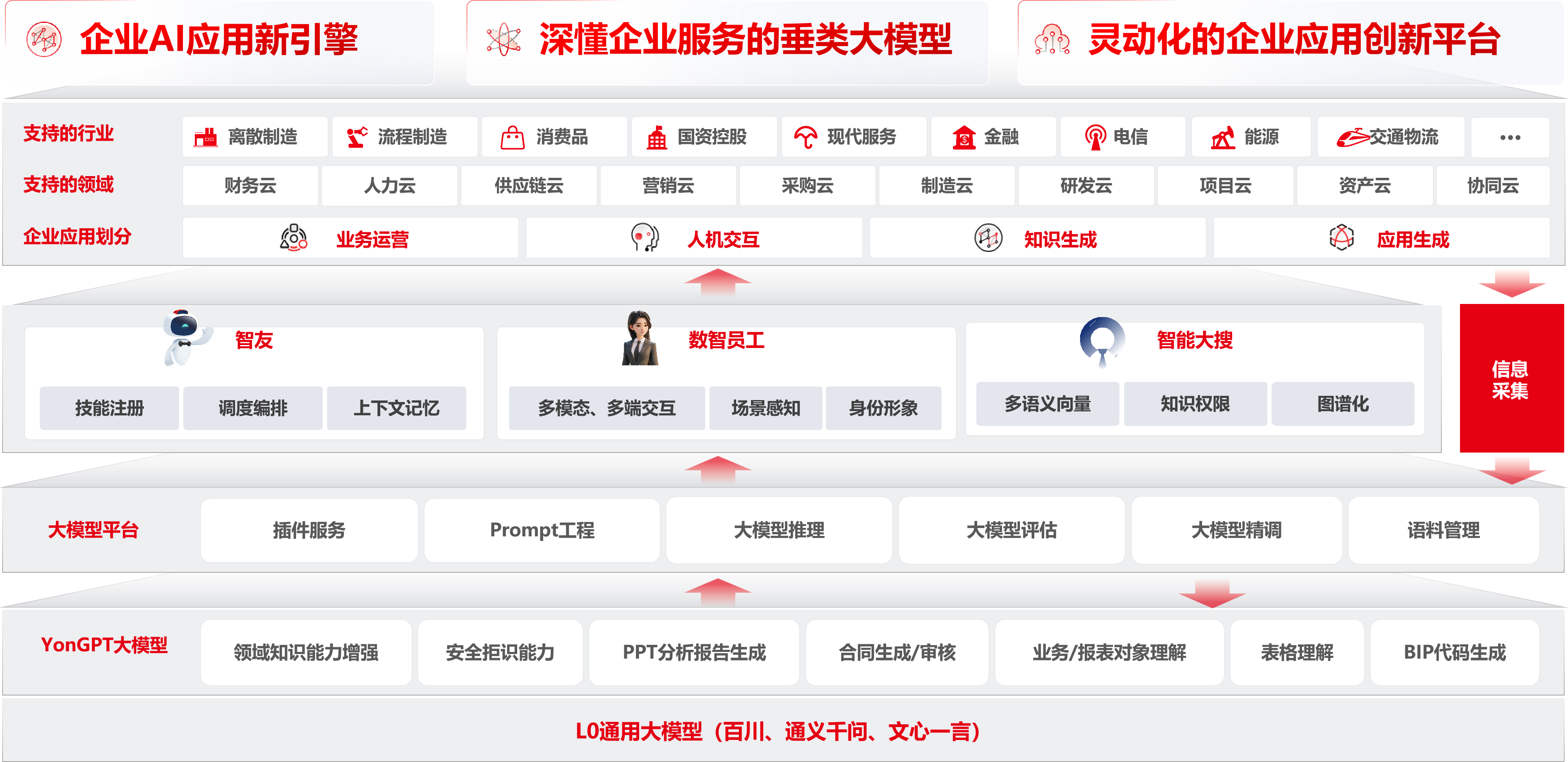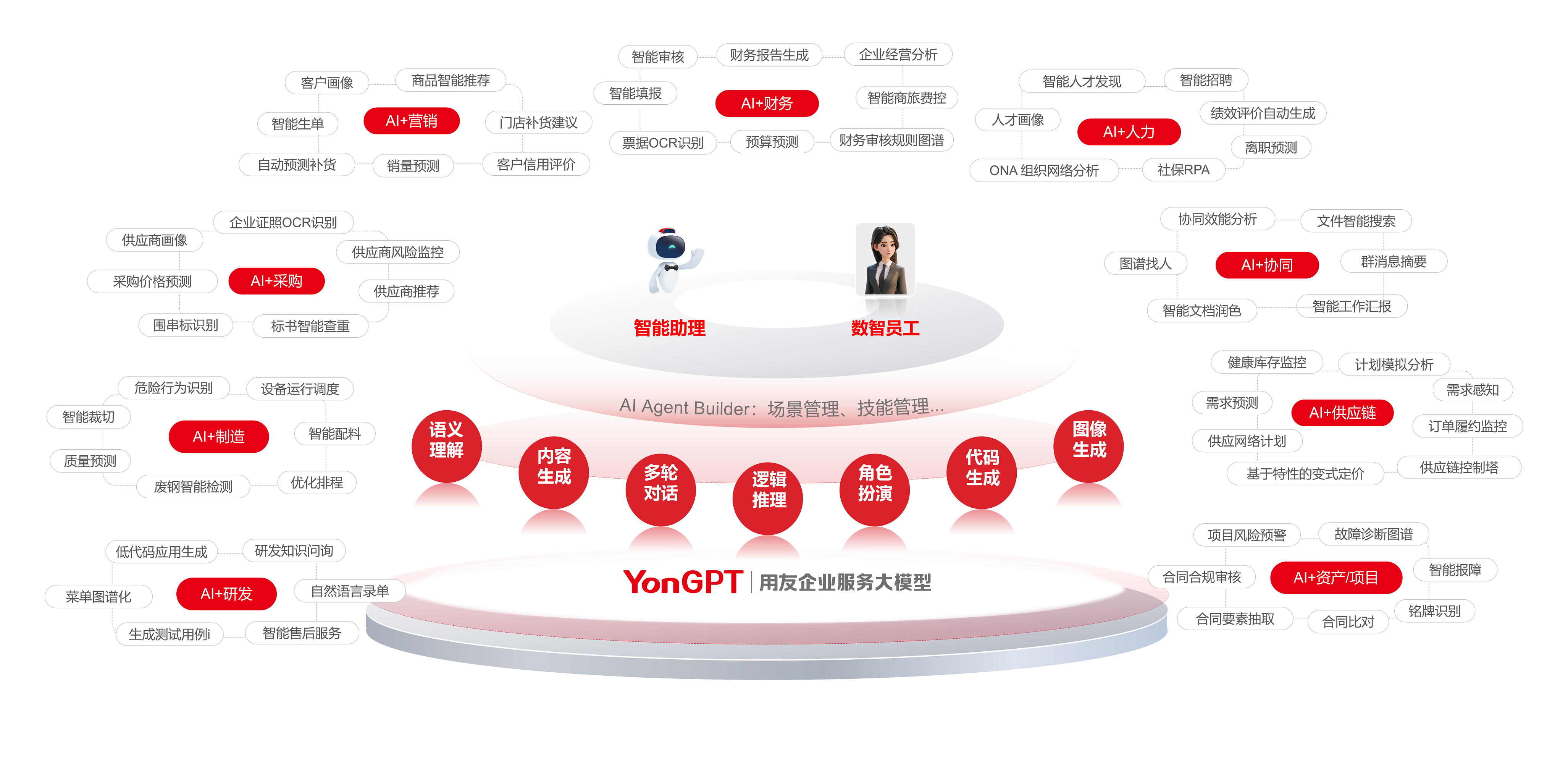 YonGPT 用友企业服务大模型是业界首个企业服务大模型,可以为企业提供智能化的人机协作、业务洞察、商业决策支持和智能运营服务,是深懂企业服务的垂类大模型。