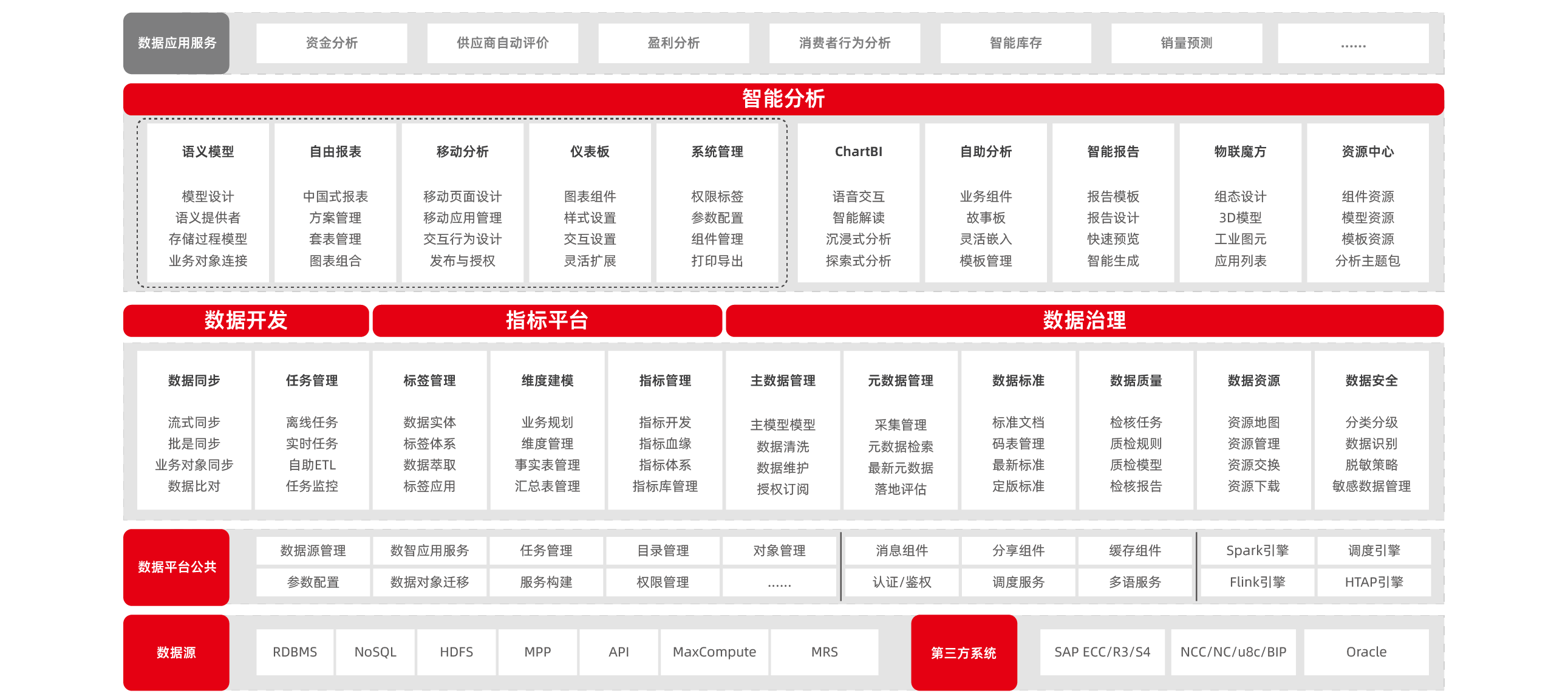 通过预置800+模型资产,包括财务(115)、商旅(37)、人力(35)、制造 (60)、采购 (43)、营销(112)、消费品(45)等十大领域主题分析,结合外部行业对标数据,凝聚用友35年管理沉淀,打造了一套深谙业务的数据架构体系。